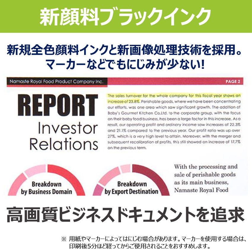 新顔料ブラックインクと新画像処理技術により、文字のにじみの原因を低減。高品質なビジネスドキュメントをお届けします。