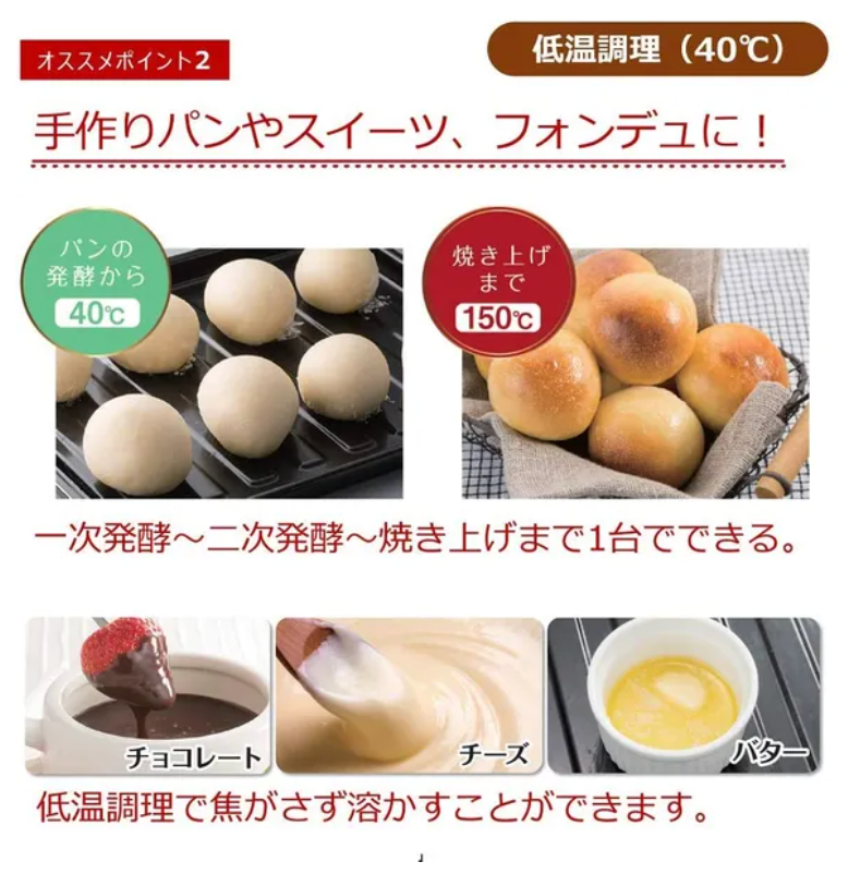 低温調理が出来るので、これ1台でパンの発酵(40℃)から焼き上げ(150℃)までできます。