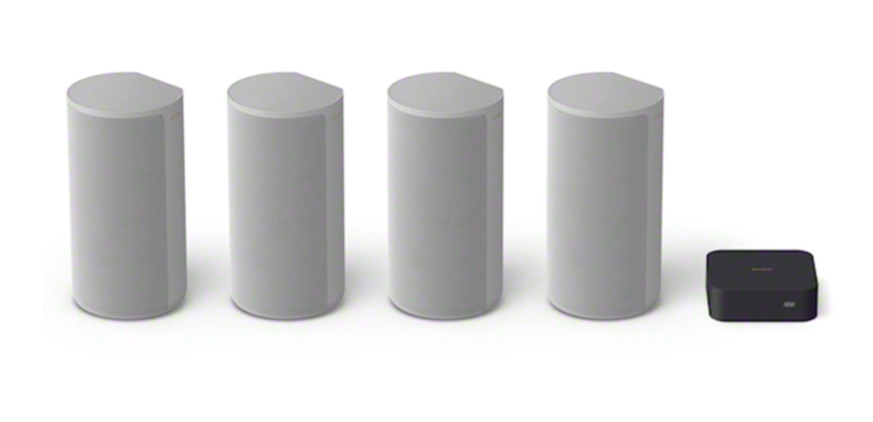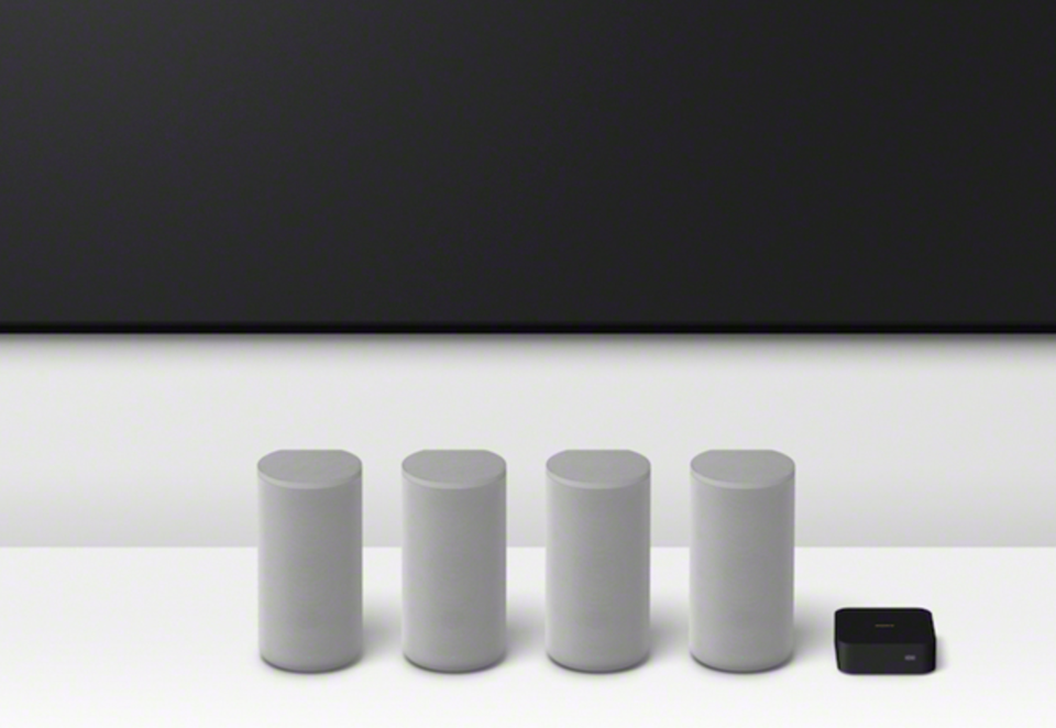 TVとHDMIで接続したコントロールボックスと4つのスピーカーはワイヤレスで接続します。4つのスピーカーは必ずしも視聴者を中心に正方形に設置する必要がなく、高さを合わせる必要もありません。設置した場所を前提に「音場最適化技術」で計測して理想的な音場空間を創り出しますので、お部屋に合わせた自由度の高いレイアウトが可能です。