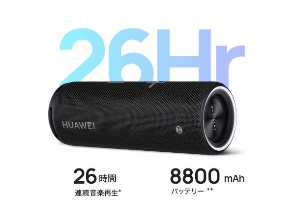 ※1 データは、スピーカーをフル充電の状態から音量を36%(65 dBA@1 m)に設定し、HUAWEIのオーディオソースを使用してBluetooth経由で音楽を連続再生した場合のファーウェイラボのテスト結果です。