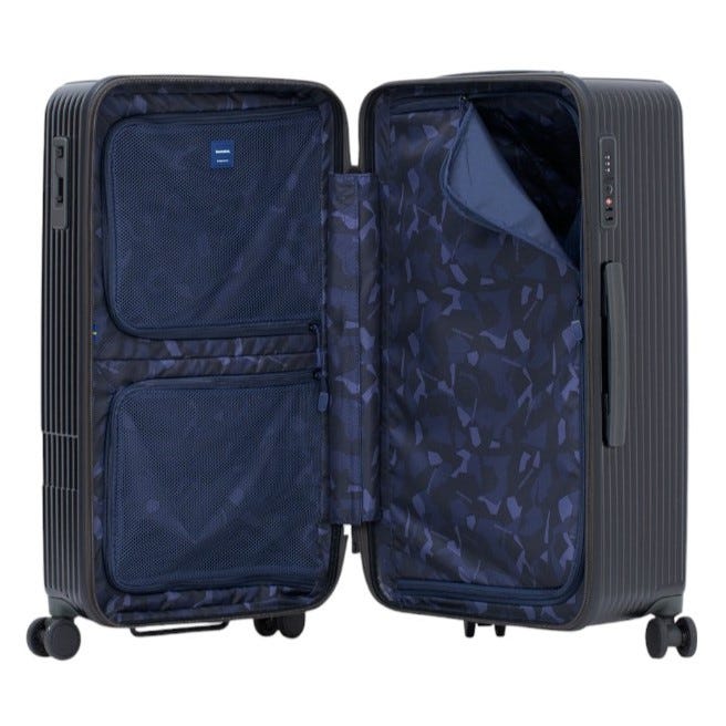 縦にスリムな形状で、通常のスーツケースより長さ・厚みのある荷物を入れることができます。また、片面(左側)は、荷物を分別収納できる様、2分割の収納方式です。メッシュ生地となっている為、中の荷物も確認できます。
