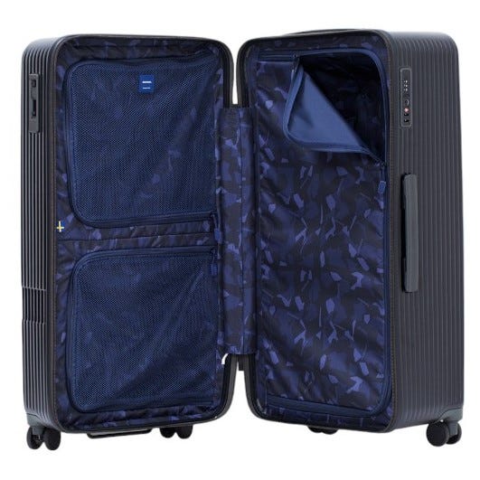 縦にスリムな形状で、通常のスーツケースより長さ・厚みのある荷物を入れることができます。また、片面(左側)は、荷物を分別収納できる様、2分割の収納方式です。メッシュ生地となっている為、中の荷物も確認できます。