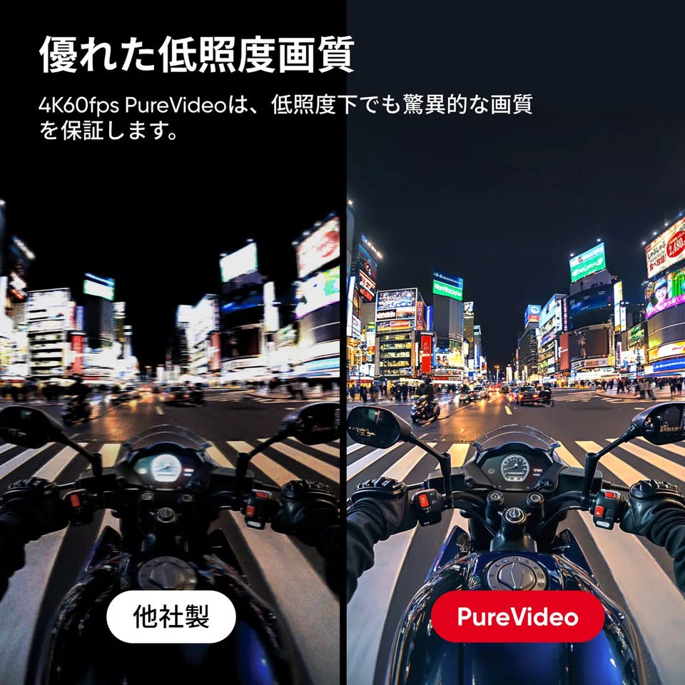 - PureVideoモード: 暗い場所でもクリアで美しい映像を撮影できる、Insta360独自の低照度撮影モードです。夜間の撮影や薄暗い室内でも、驚くほど鮮明な映像を残せます。