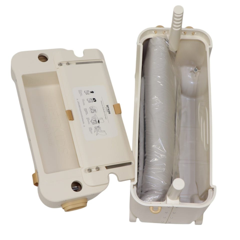 機内では、5つの簡単なステップでジェットキッズがスーツケースからベッドへと早変わりします。