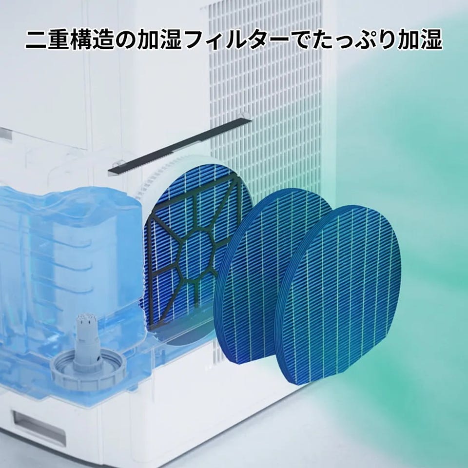 集めた風を2枚の加湿フィルターで加湿。風を2回通すことでより多くの水を気化して放出します。