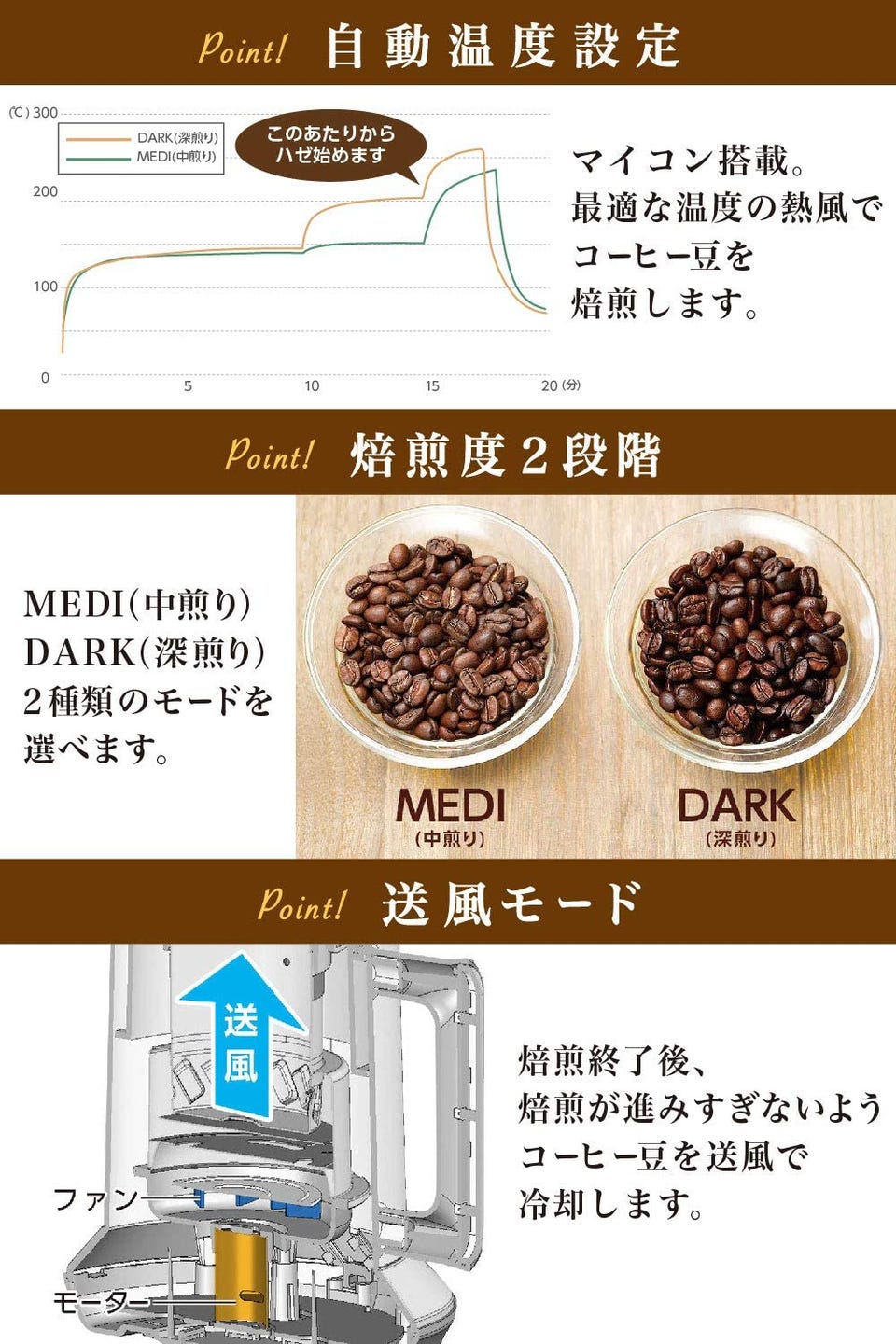 コンピューター制御によって温度と風量を自動管理。マイコンが搭載されており、時間ごとに焙煎に最適な温度の熱風でコーヒー豆を焙煎します。