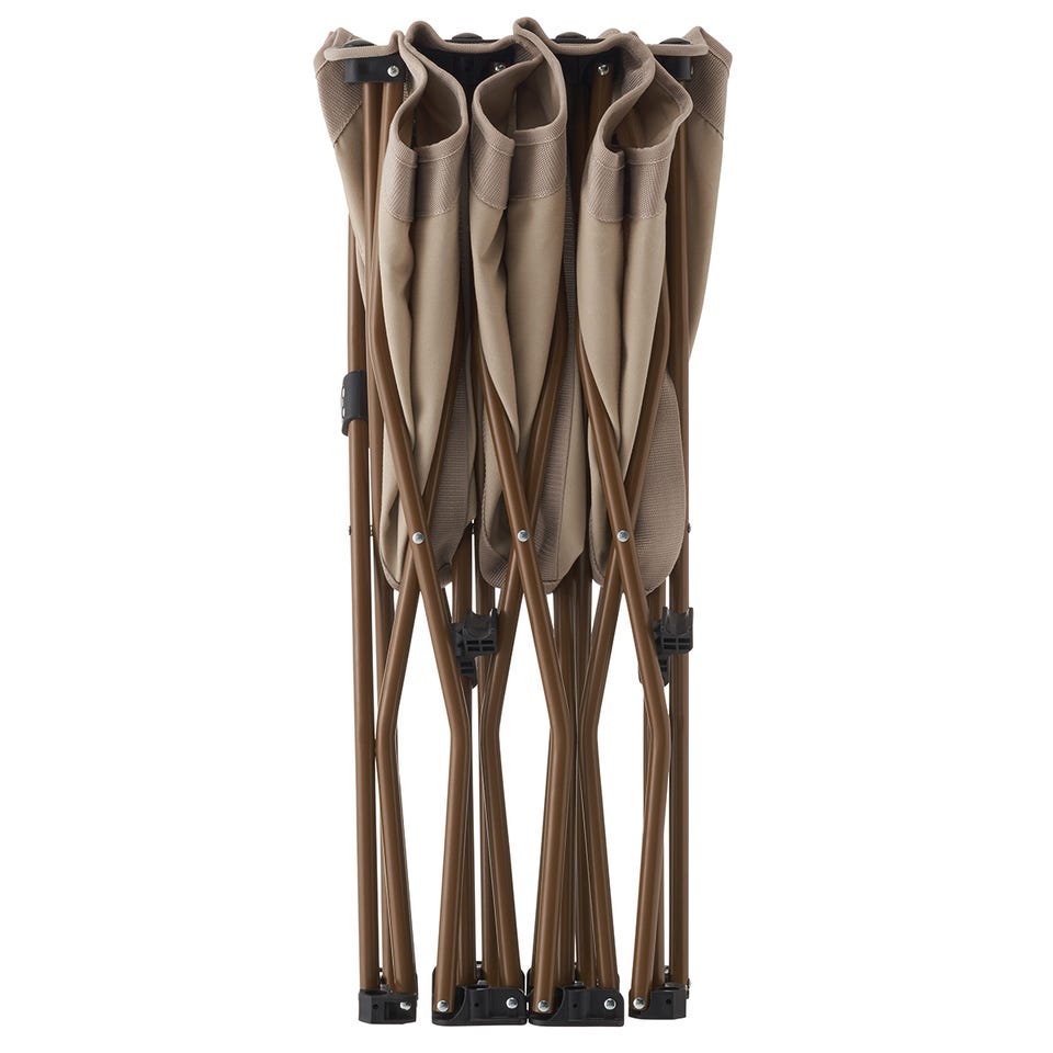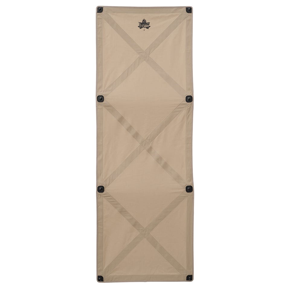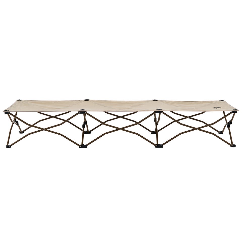 広げるだけでセッティングが完了する、組立て不要の収束型ベッド。独自構造の湾曲したフレームで、ベッドとして使いやすい高さ約35cmを維持しながらシート部分の広さも確保している。キャンバス地のような風合いの生地はテントサイトにマッチし、寝心地も快適。