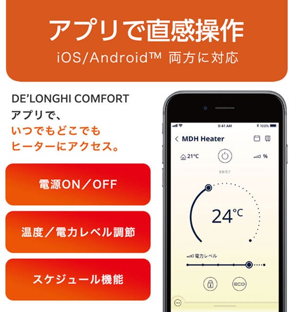 DE’LONGHI COMFORTアプリがリモコン代わりに。電源ON/OFFや温度の調節など基本的な操作はすべてアプリから簡単に行うことができます。iOS/Android™ 両方に対応*