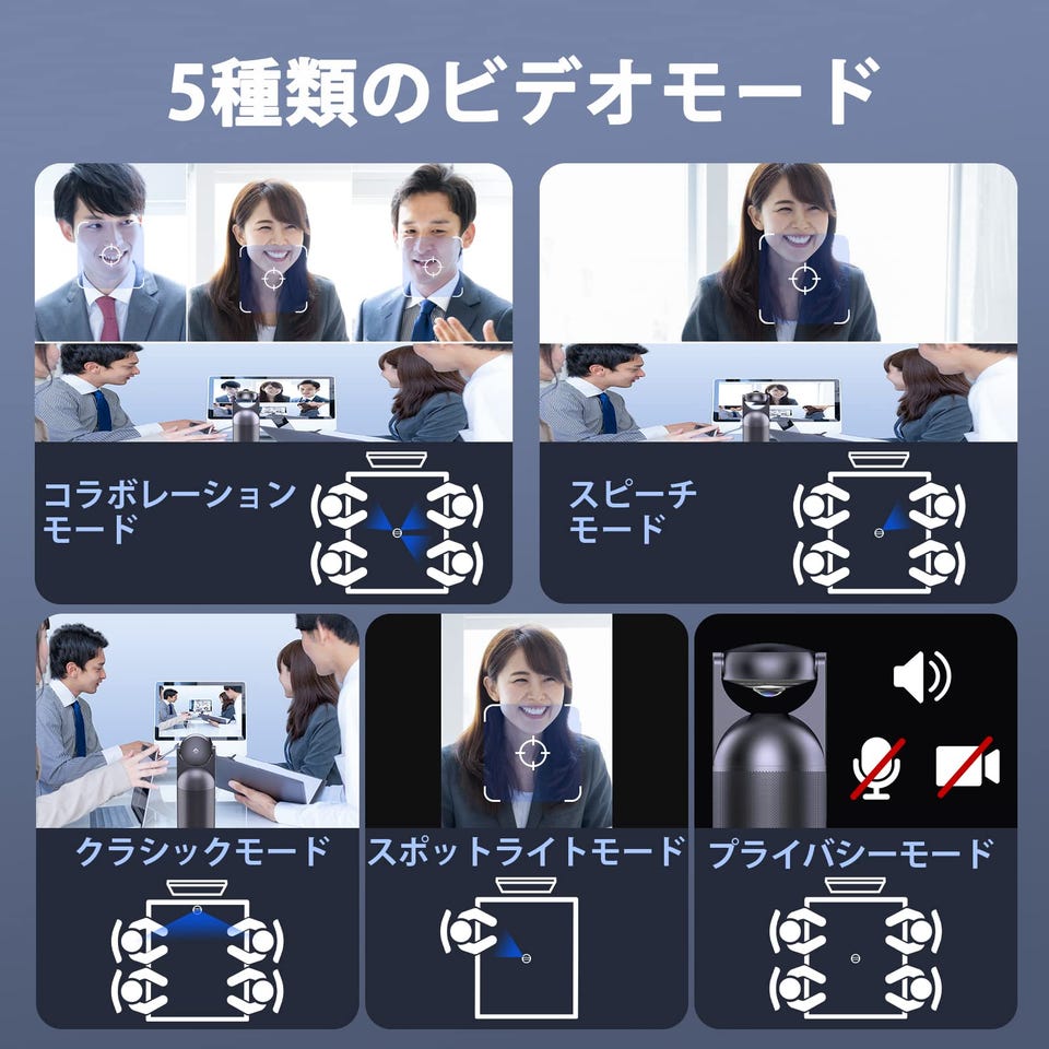 レンズの三モデルの回転で、ミーティングのモード変更と視野角調整が対応できます。また、アクティブなレンズ機能を利用し、ミーティングを退屈からよりダイナミックにすることができます。