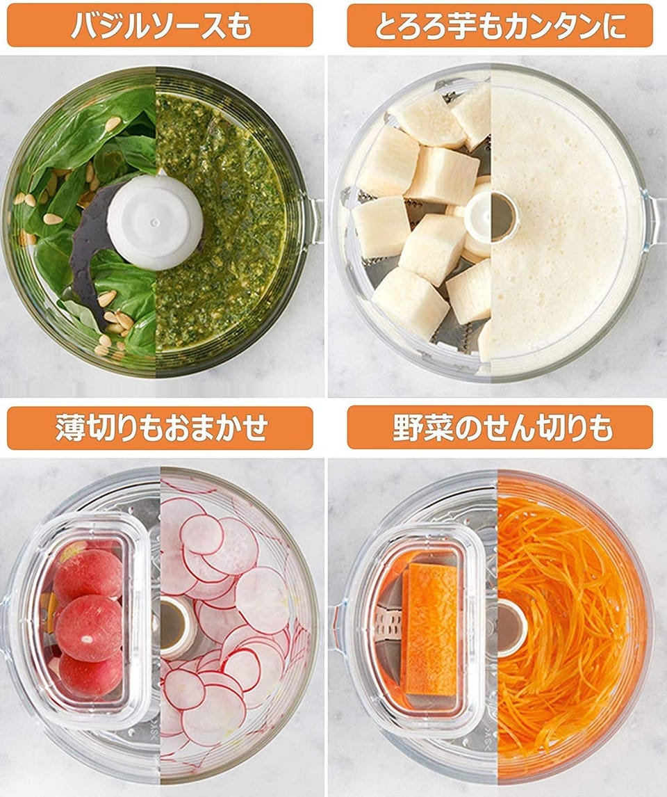 鬼おろしの特徴を再現した「鬼おろしカッター」を搭載。水分が出にくいので、素材のシャキシャキした食感を生かしたい料理にピッタリ。フードプロセッサーの使用シーンが広がります。