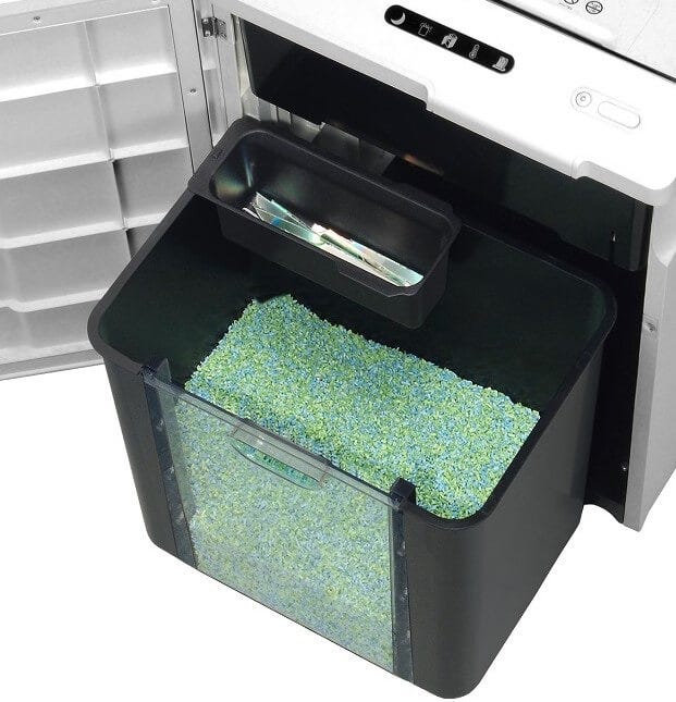 データメディア投入口から投入し、細断したデータメディアはくず箱内の専用トレイに分別収容でき、紙と混ざることはありません。