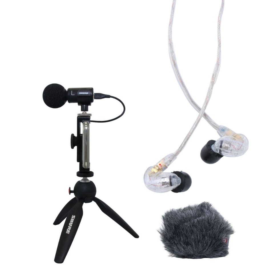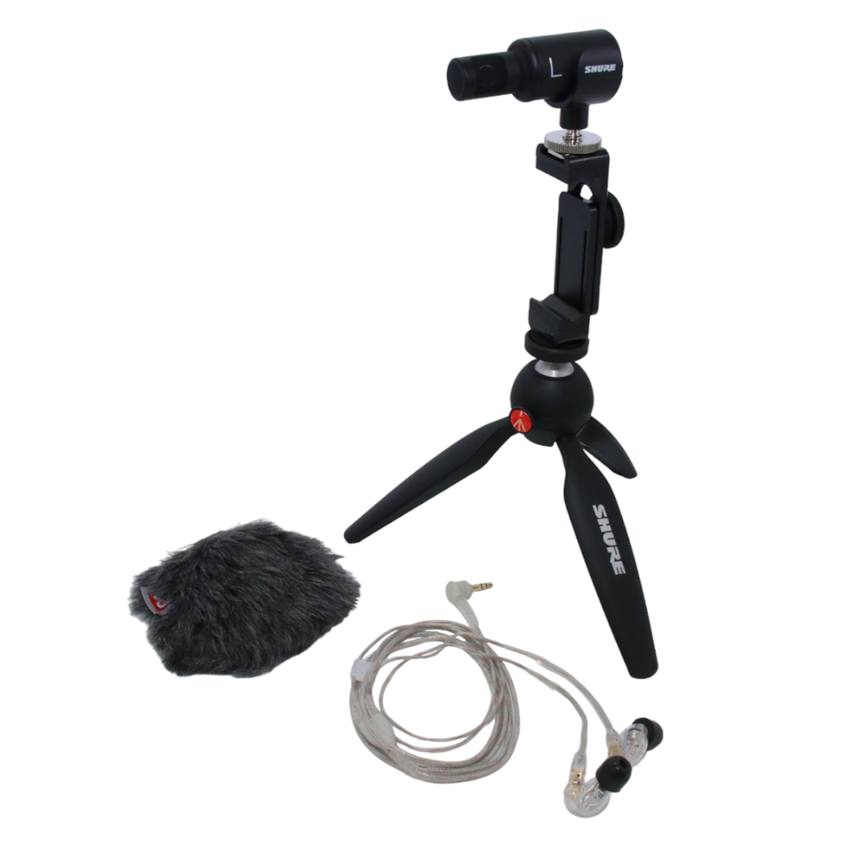 コンテンツ制作に必要な機能とツールがすべて揃ったMV88+ ビデオキット、モニタリングに最適なSE215高遮音性イヤホン、屋外撮影時の風の吹かれ音を低減するウィンドジャマーのすべてが一つに! どこでもプロフェッショナルな録音を可能にする音声・動画コンプリートセット。