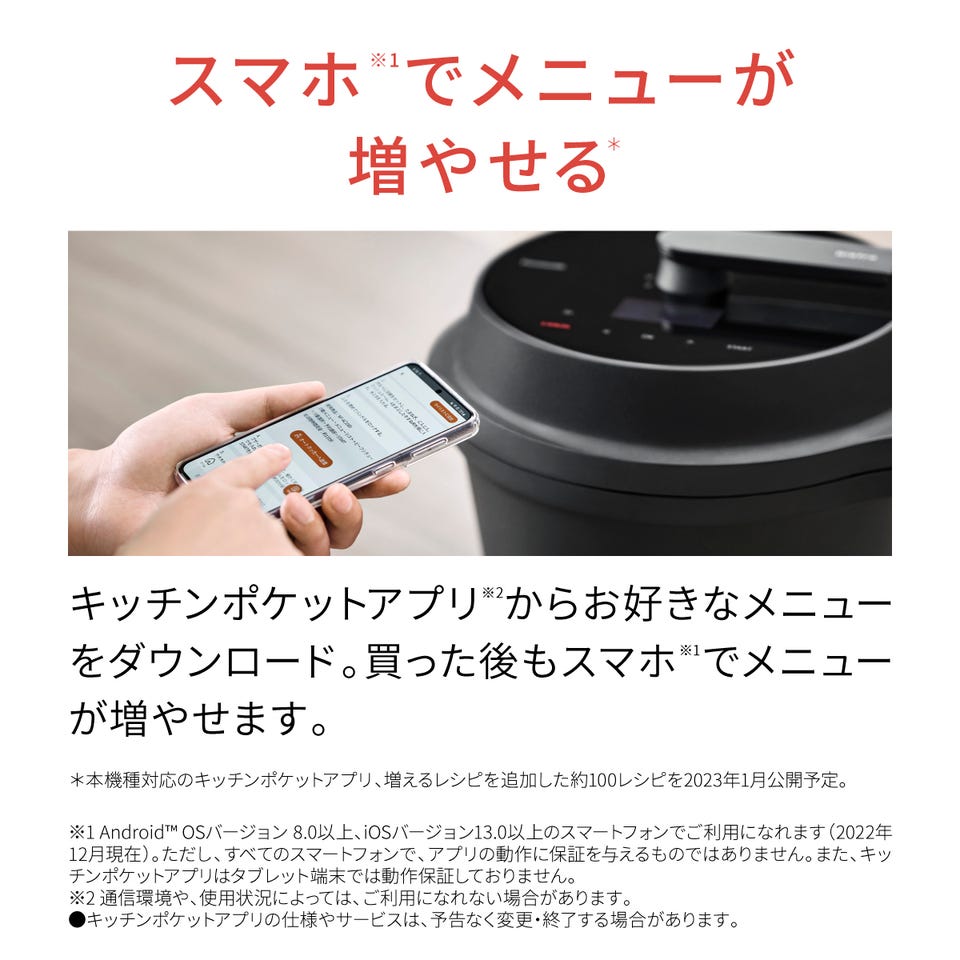 ※5 Android™ OSバージョン 8.0以上、iOSバージョン 13.0以上のスマートフォンでご利用になれます(2022年12月現在)。ただし、すべてのスマートフォンで、アプリの動作に保証を与えるものではありません。また、キッチンポケットアプリはタブレット端末では動作保証しておりません。