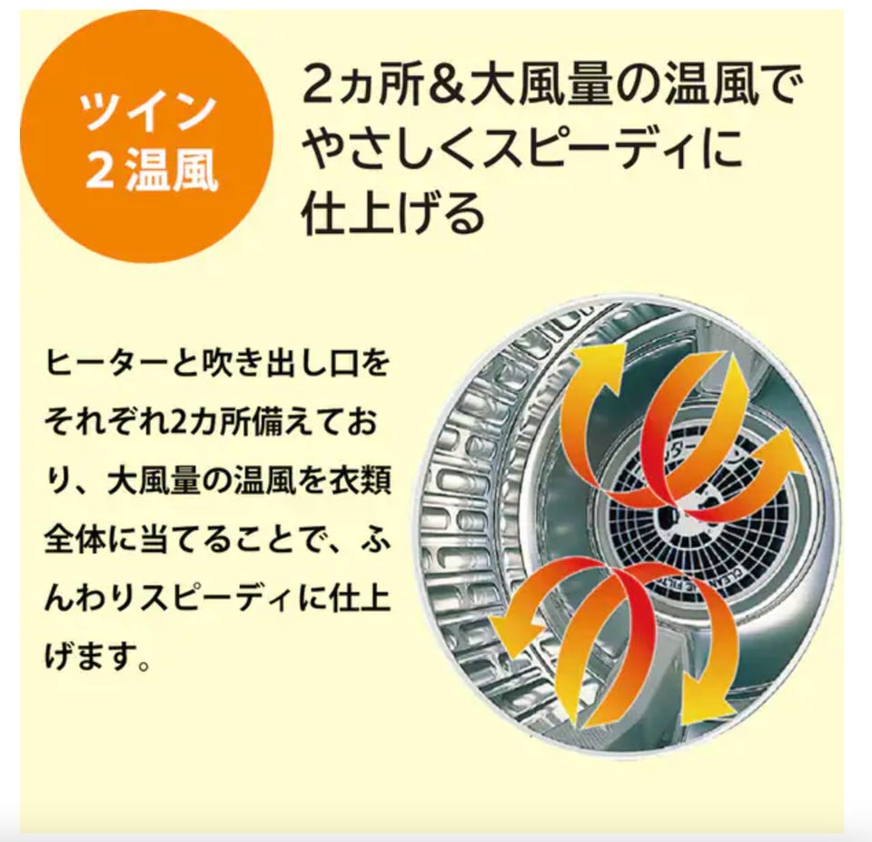 2層ステンレスドラム/ツイン2温風/フィルター目詰まり報知/ふんわりキープ/あと10分表示