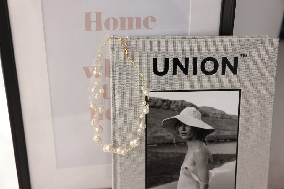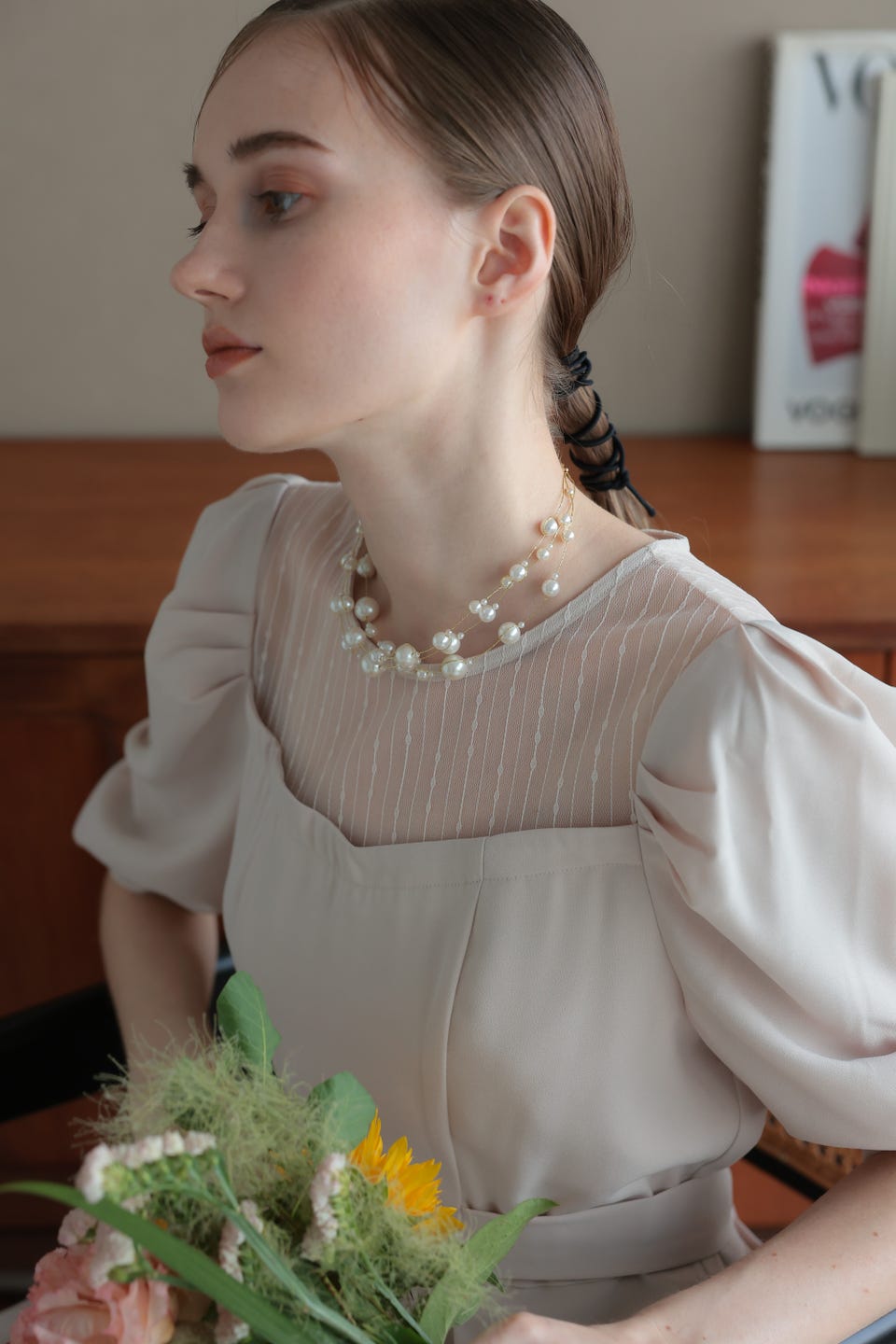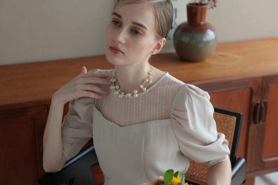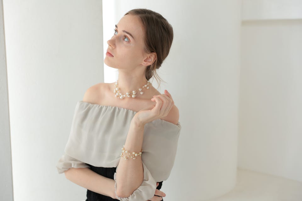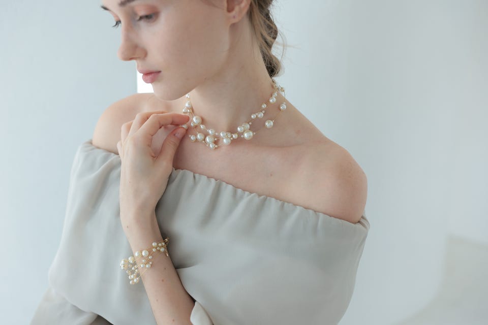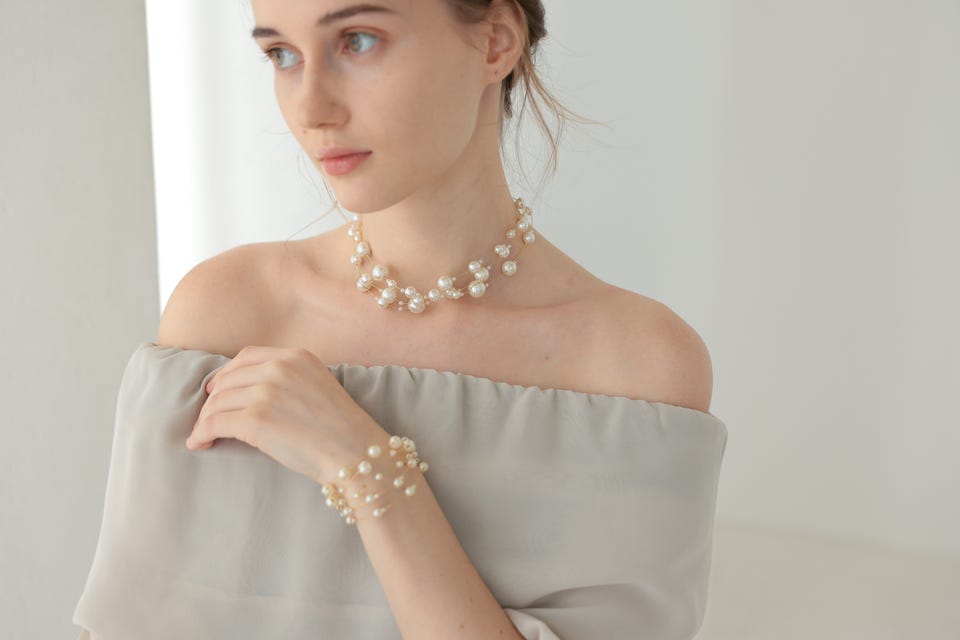 パールの柔らかな輝きとエアリー感がエレガントな印象で、パーティースタイルのデコルテラインを華やかに演出してくれます。