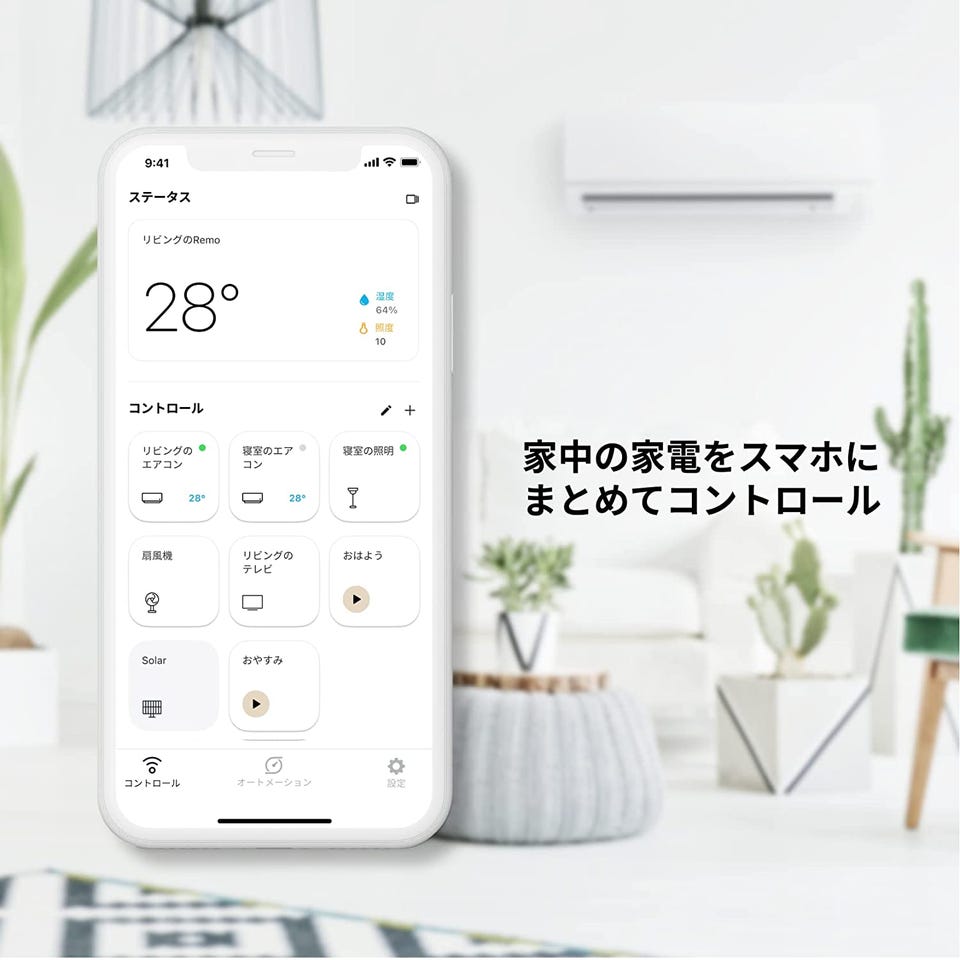 Nature Remo(ネイチャーリモ)は、ご自宅のリモコンをスマホひとつにまとめたり、外出先からもスマホでエアコンなどの家電を操作することができるスマートリモコンです。設定が簡単でメーカーや型番・年式などに関係なく、古いエアコンやテレビなどの旧式の家電にもお使いいただけます。