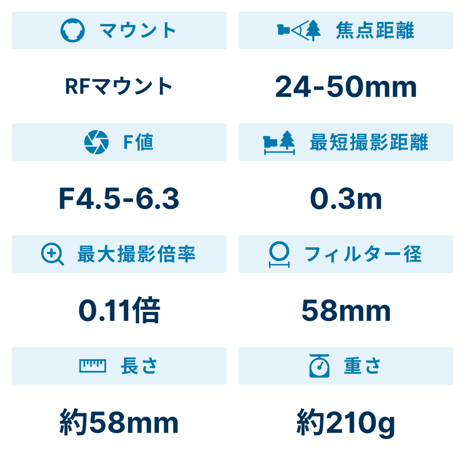 RF24-50mm F4.5-6.3 IS STMは、フルサイズに対応する小型・軽量の標準ズームレンズとして誕生しました。全長は58mm、質量は約210gと非常にコンパクトかつ持ち運びで苦にならない重量感を最大の特徴としています。小型・軽量ながらレンズ内に手ブレ補正機構を搭載しており、単体で4.5段、ボディ内手ブレ補正搭載モデルとの協調で7.0段の補正効果を実現します。