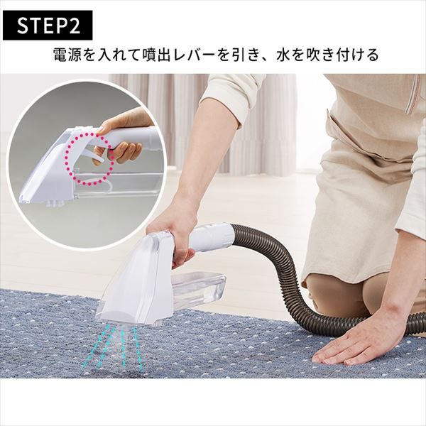 水を吹きつけながら、カーペットの汚れをすすいで強力吸引!