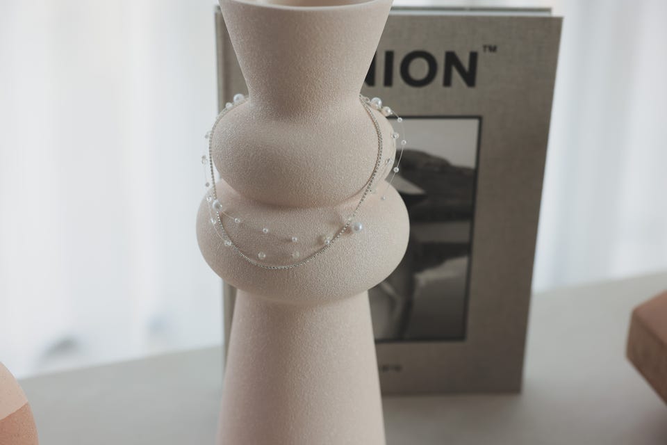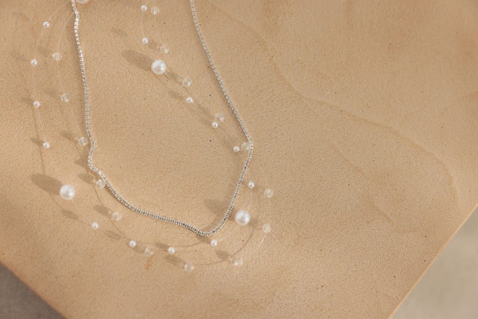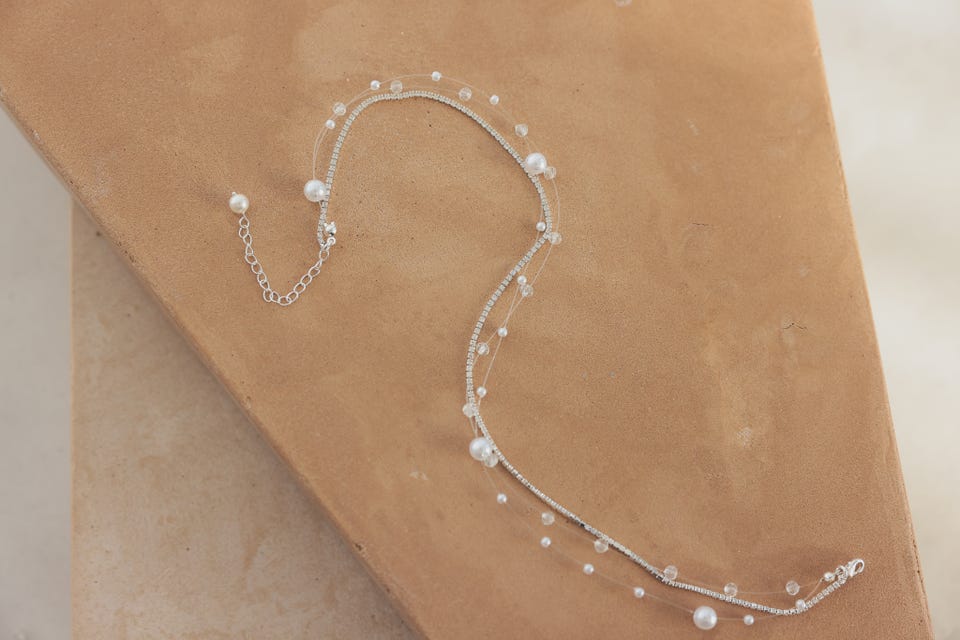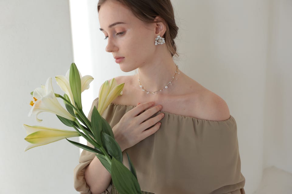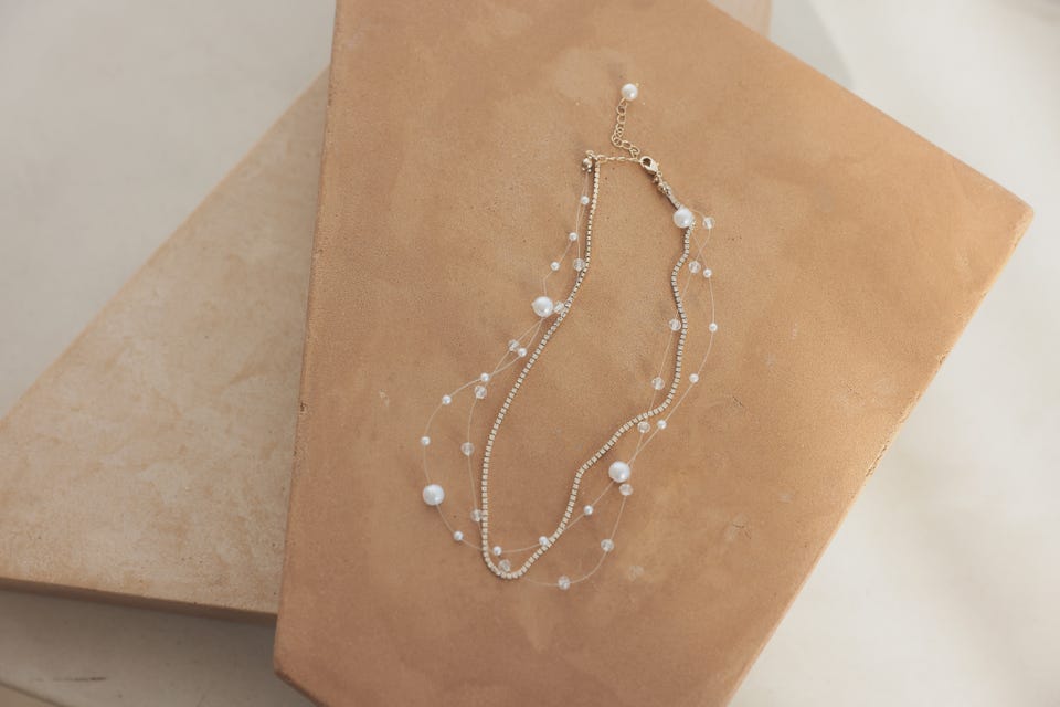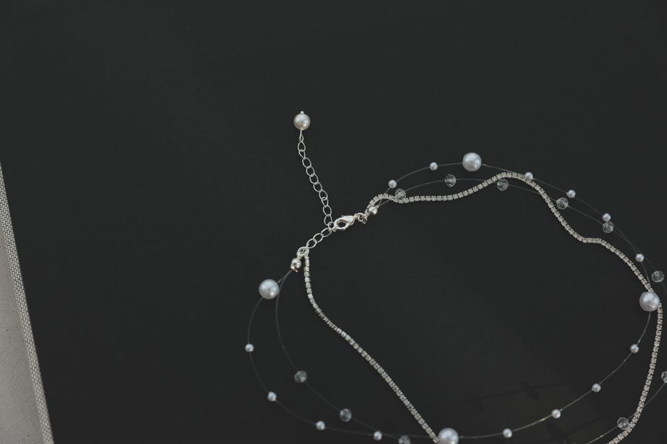 華奢なビジューパールの3層デザインでトレンド感のあるモダンな印象、かつデコルテラインを綺麗に見せてくれます。