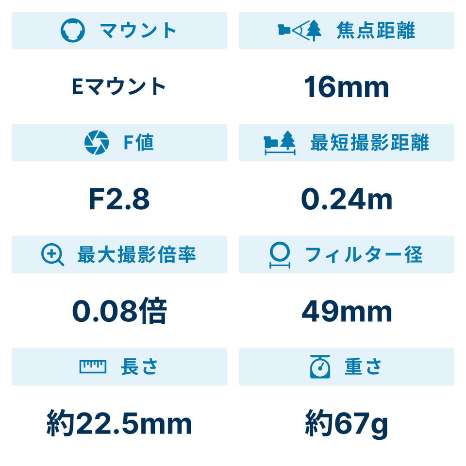 SONY E 16mm F2.8では、使いやすい画角だけでなく、α6000シリーズを中心としたAPS-Cセンサーモデルのサイズ感にフィットする圧倒的なコンパクトさを叶えています。薄さは22.5mmmで、重さも約67gと超小型・軽量サイズを実現しており、比較的持ち運びが楽な単焦点レンズの中でも圧倒的な携帯性を叶えました。