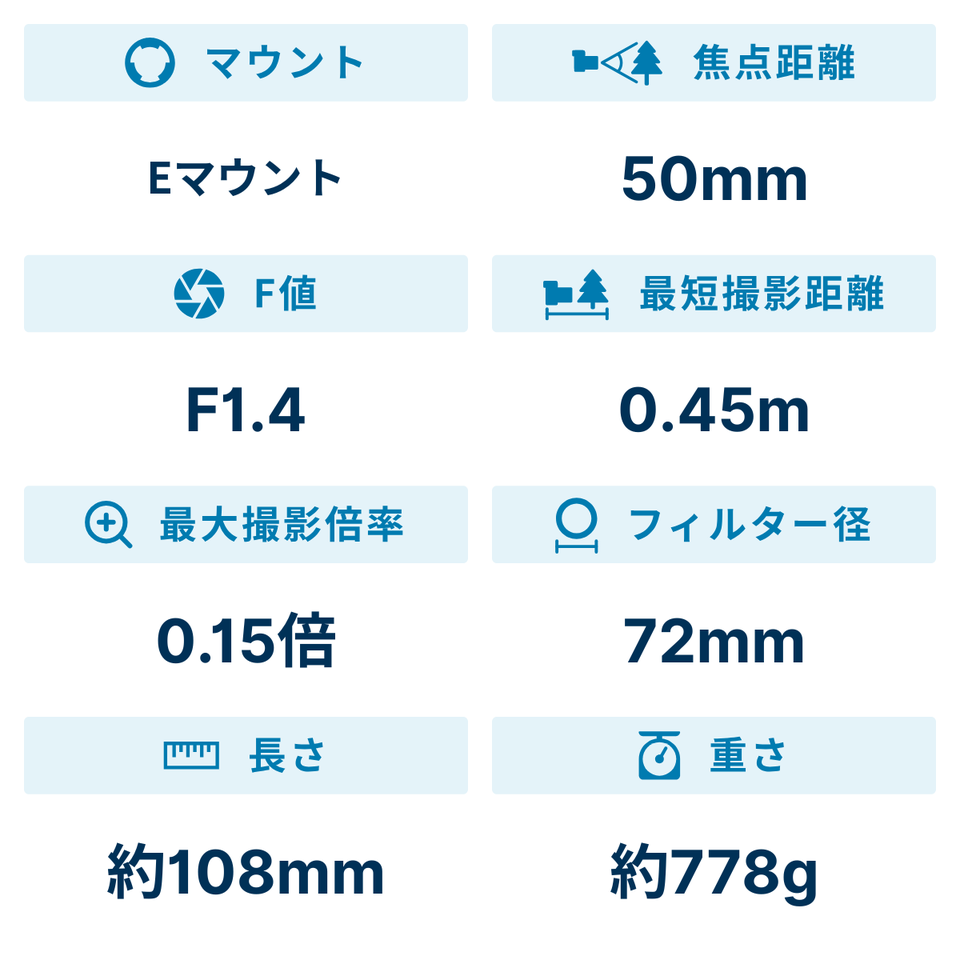 フォーカス駆動には、大きなフォーカスレンズを高精度に動かせるリングドライブSSM(Super Sonic wave Motor)を採用。被写界深度が極めて浅いF1.4の大口径レンズに必要な精度の高いピント合わせを実現しています。これにより、静止画でも動画でも、高解像度撮影に求められるシビアなピント合わせが可能です。