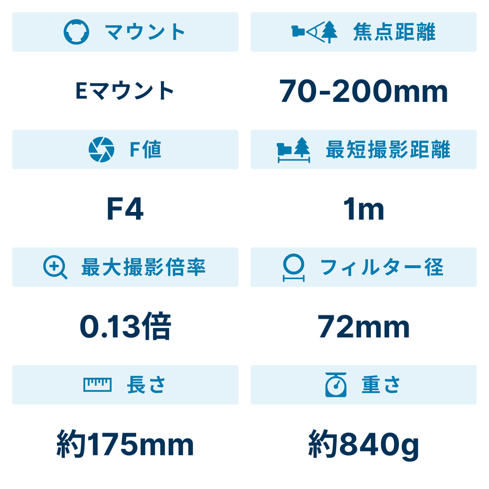 FE 70-200mm F4 G OSSは、35mmフルサイズに対応した望遠ズームレンズです。撮影時の利便性を考慮して、フォーカシングによる全長変化がないインターナルフォーカシング方式を採用。さらに徹底した軽量化により、携行性にも優れています。α7シリーズのコンセプトにマッチする、高い画質とコンパクト性を両立しています。