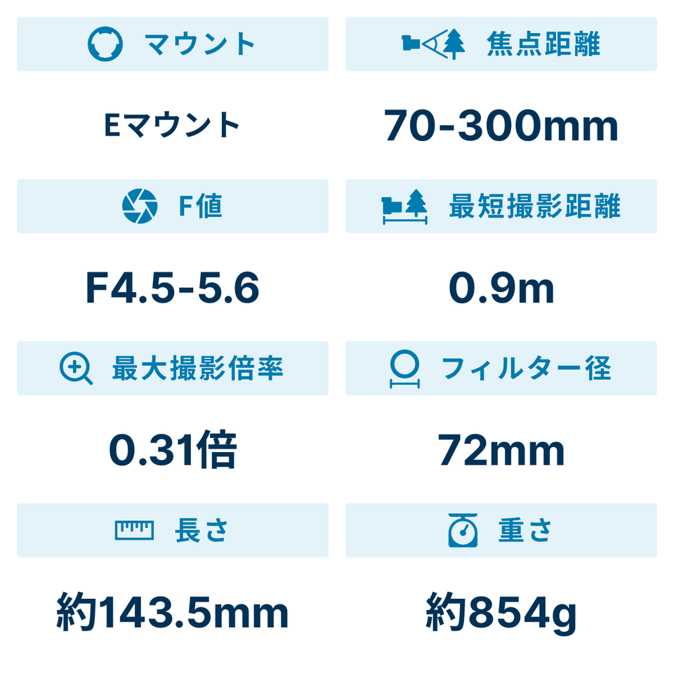 Eマウント35mmフルサイズ対応で300mmまでの望遠域をカバーする高解像望遠ズームレンズです。