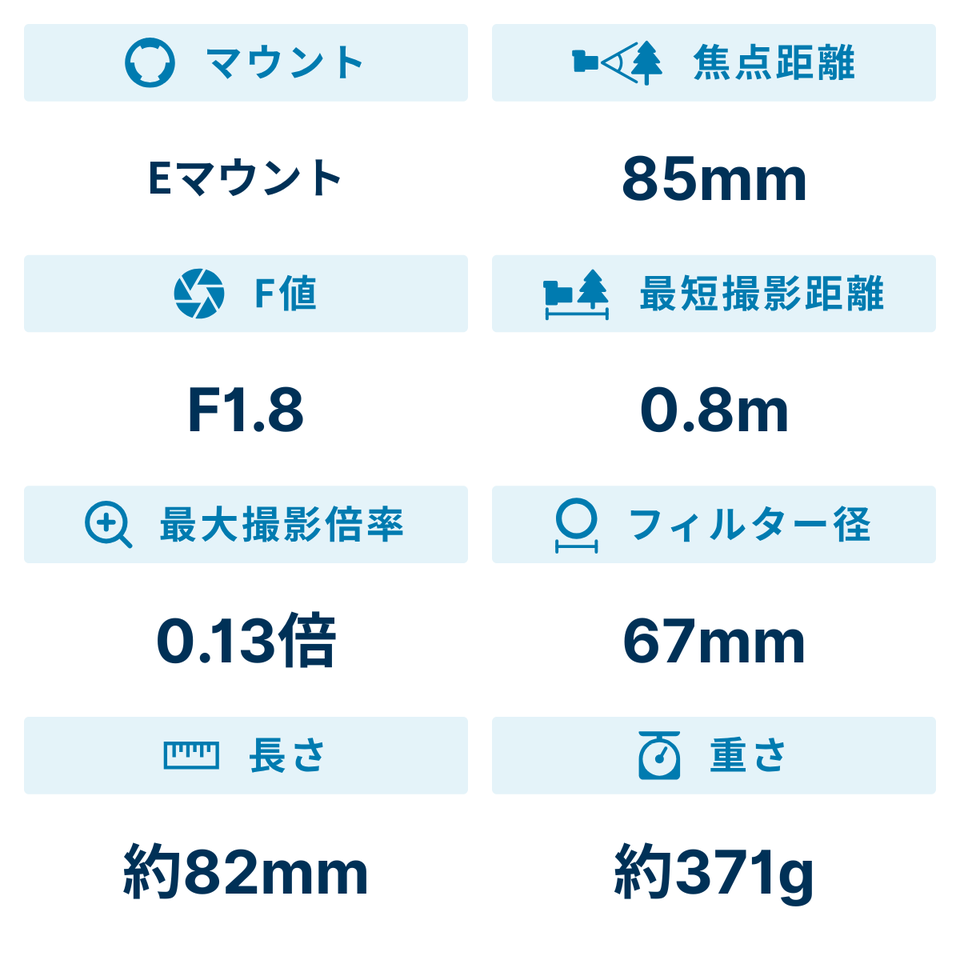 単焦点レンズならではの描写力とぼけ味を楽しめる、35mmフルサイズ対応の大口径中望遠単焦点レンズです。ED(特殊低分散)ガラスの採用により、色収差を良好に補正。さらに、9枚羽根円形絞りの採用と球面収差形状の最適化により、画面周辺までシャープな描写と自然で美しいぼけ味を実現。最大径78mm×長さ82mm、質量約371gの小型・軽量設計で携行性にも優れています。フォーカス駆動には、レスポンスに優れ、高速・高精度な制御が可能なダブルリニアモーターを搭載。静止画撮影時に限らず動画撮影時でも、静粛で高精度なピント合わせが可能です。また、フォーカスモードスイッチ、フォーカスホールドボタンも搭載。防塵・防滴に配慮した設計も施しています。85mmの大口径単焦点レンズならではの背景ぼけを生かした、印象的なポートレートを手軽に撮影できます。