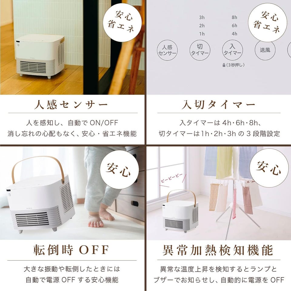 大きな振動を感知した際や転倒時には自動で電源が切れる「転倒・振動検知機能」や、異常な温度上昇を感知してブザーで知らせる「異常検知ブザー」、お子様やペットのいるご家庭でも安心の「チャイルドロック機能」や10時間続けて運転すると自動的に停止する「10時間後自動運転停止機能」など、安全面に配慮した設計で毎日安心して使えます。