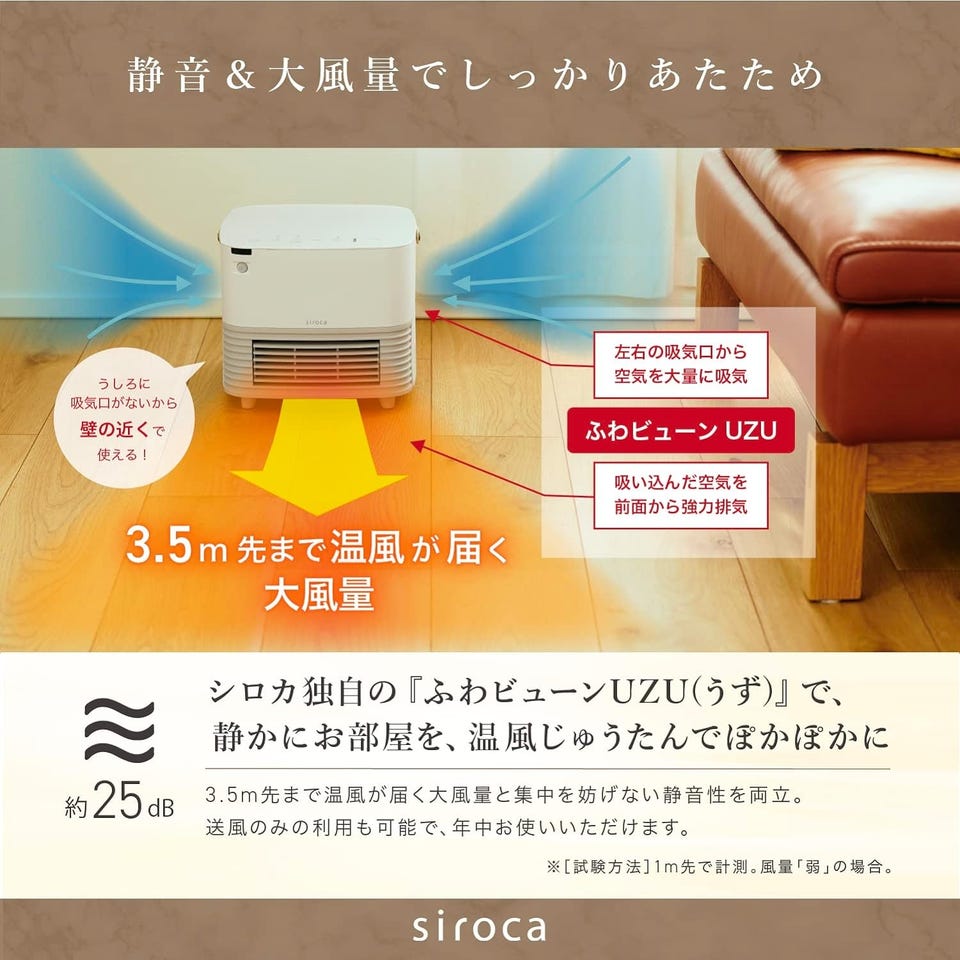 本製品は、3.5m先まで温風が届く大風量なのに、強モードでもささやき声レベル静音性。左右の吸気口から空気を吸い込み、前面から強力に排気する構造で、大風量と静音性を同時に実現。日本ブランドのミネベア製モーターでさらに静かに。