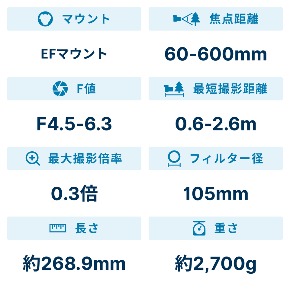 これまで超望遠ズームレンズとして人気を集めていた同社の150-600mmとの違いとして、焦点距離の違い以外にもこちらの60-600mmの方が軽量で小型というメリットがあります。