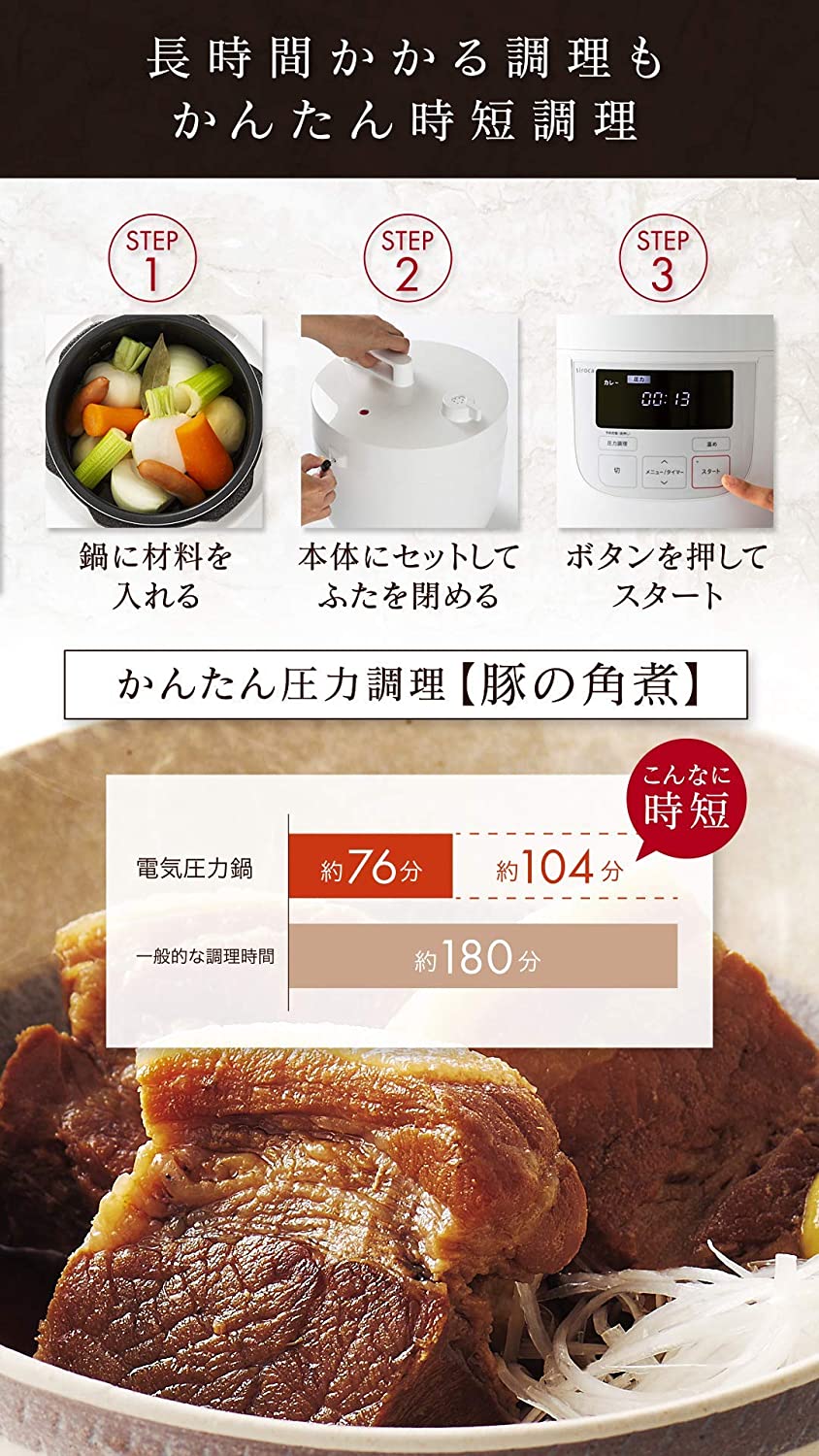 長時間かかる角煮や黒豆も時短できて、おいしく仕上がります。しかもおいしく仕上がるので、いつもの料理がカンタンにワンランクアップの仕上がりに。
