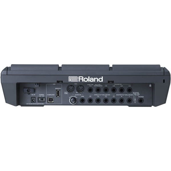 PHONES端子(ステレオ標準タイプ) MASTER OUT端子(L、R)(BALANCED)(TRS標準タイプ) DIRECT OUT端子×4(MONO)(BALANCED)(TRS標準タイプ) AUDIO IN端子(ステレオ標準タイプ)(TRS標準タイプ)(VOLUMEコントロール付き) TRIG IN端子×4(1/2、3/4、5/6、7/8)(TRS標準タイプ) FOOT SW端子×1(1/2)(TRS標準タイプ) HH CTRL/EXPRESSION端子(TRS標準タイプ) MIDI端子(IN、OUT/THRU) USB COMPUTER端子:USB Bタイプ(High-Speed USB、USB-AUDIO、USB-MIDI、APP) USB MEMORY端子:USB Aタイプ(High-Speed USB、バックアップ/リストア、SAMPLEインポート/エクスポート) DC IN端子