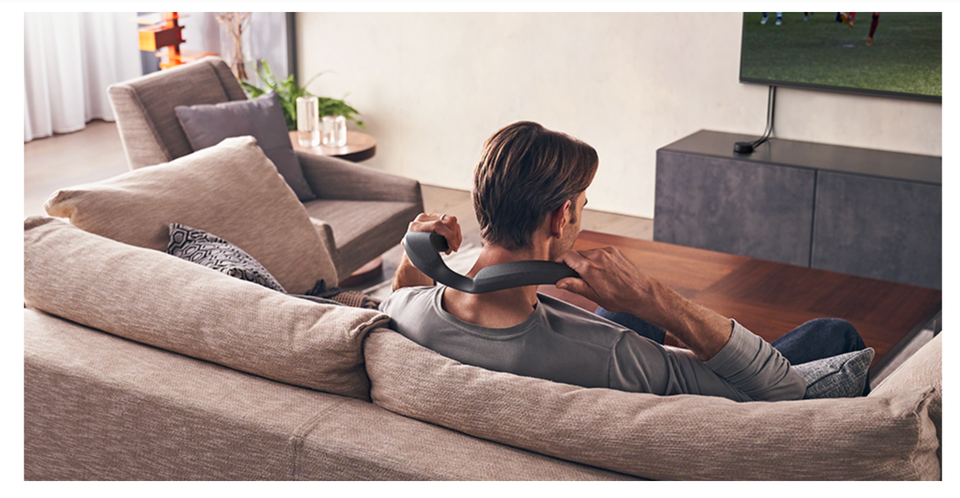 肩にのせるだけで、映像の中に入り込んだような迫力サウンドを楽しめるワイヤレスネックバンドスピーカー