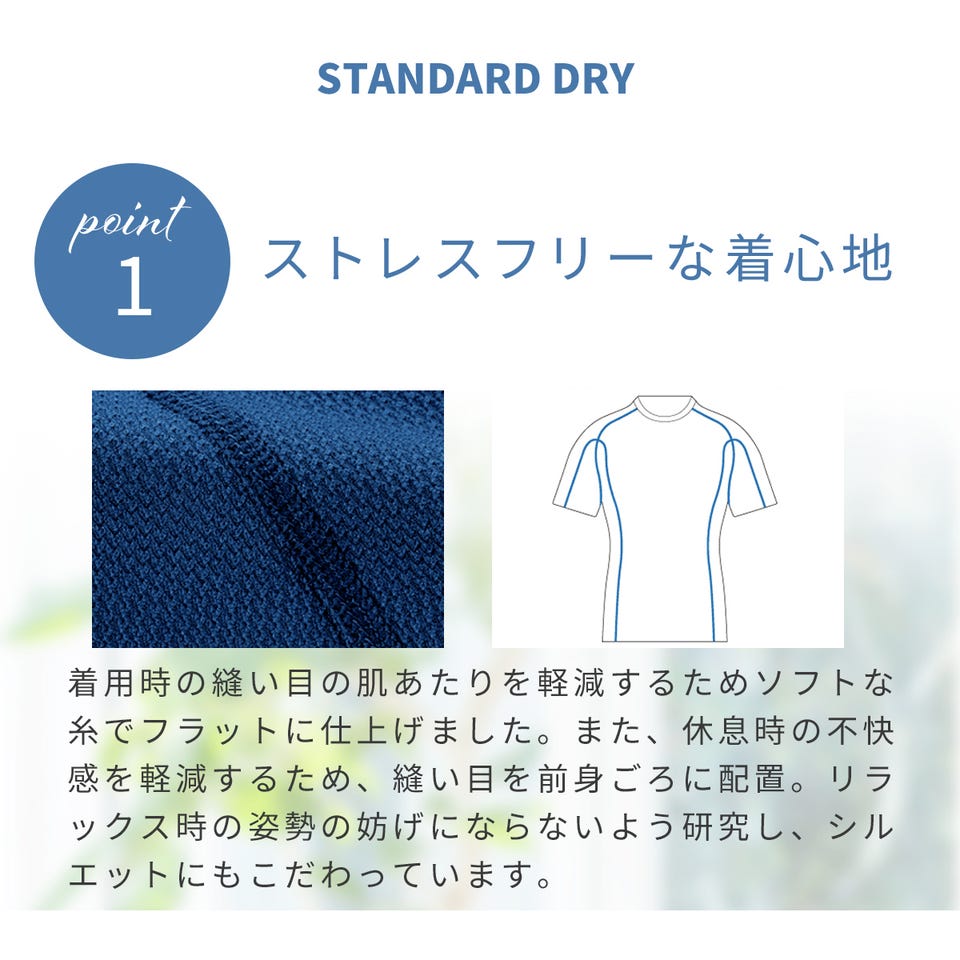 「スタンダードドライ」シリーズのウエアは、リラックスする場面でもウェアがルーズに見えないようシルエットにもこだわり、ストレスを感じさせてない程度の細身のデザインを採用しました。
