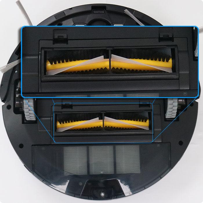 X5のメインブラシは、シリコン羽根と剛毛ブラシが一体になった高性能ダブルV式ブラシです。カーペットの奥深くまでしっかりと汚れやホコリを掻き込み、掻き取ります。