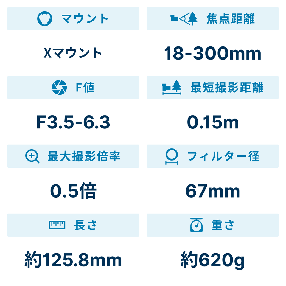 *2 35mm判換算27-450mm相当(ソニー Eマウント用、富士フイルム X マウント用、ニコン Z マウント用)、28.8-480mm相当(キヤノンRFマウント用)。