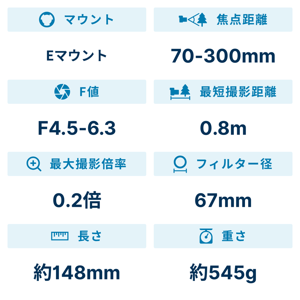 望遠300mmを気軽に楽しんでいただくため、タムロンがこだわったのが徹底した小型・軽量化でした。これまでの望遠レンズのイメージを大きく覆す、長さ148mm、最大径φ77mm、重さ545gのレンズサイズは大きさや重さを気にすることなく思う存分撮影にのめり込むことができます。初めて本格的な望遠撮影に挑戦するという方はもちろん、ボディ内手ブレ補正搭載のカメラや三脚を使用しての撮影で荷物を軽量化したい方にもおすすめです。また、APS-CサイズのEマウントカメラとの組み合わせでも良好なバランスを維持できるため、さらに望遠効果が大きい約450mm相当2の撮影を楽しむことも可能です。