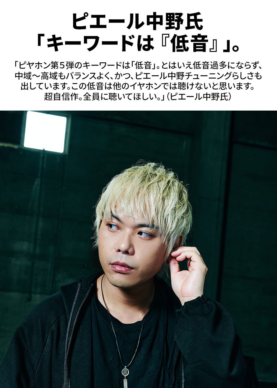 ピヤホン第5弾のキーワードは『低音』。とはいえ低音過多にならず、中域〜高域もバランスよく、かつ、ピエール中野チューニングらしさも出しています。この低音は他のイヤホンでは聴けないと思います。