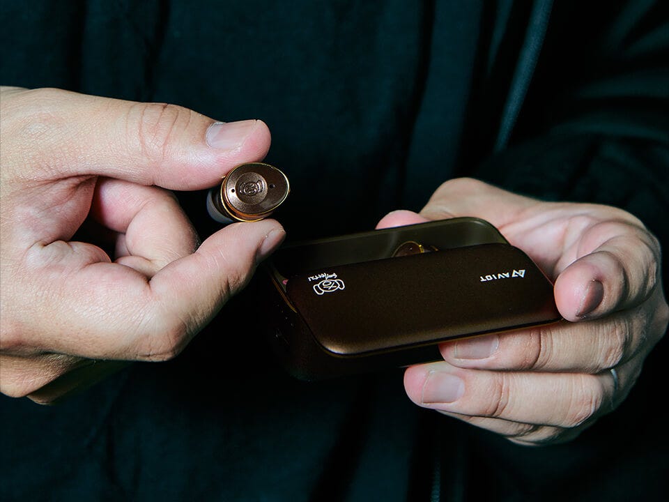ユニークなスライド式ドアを採用したチャージングケースにも、高品位ジュラルミン素材を使用することで、高級感を演出しました。