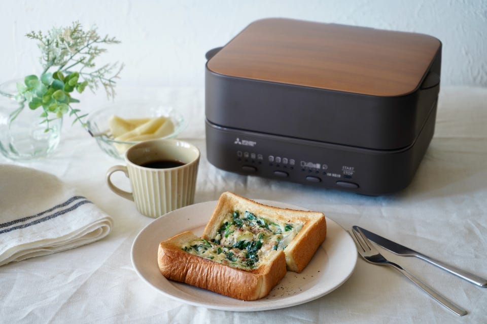 本体天面は木目調、本体側面はレトロなブラウンにすることで、ダイニングテーブルになじむ配色に。サイズもコンパクトで、ダイニングテーブルに出して、焼きたてをすぐに味わえるデザインになっています。