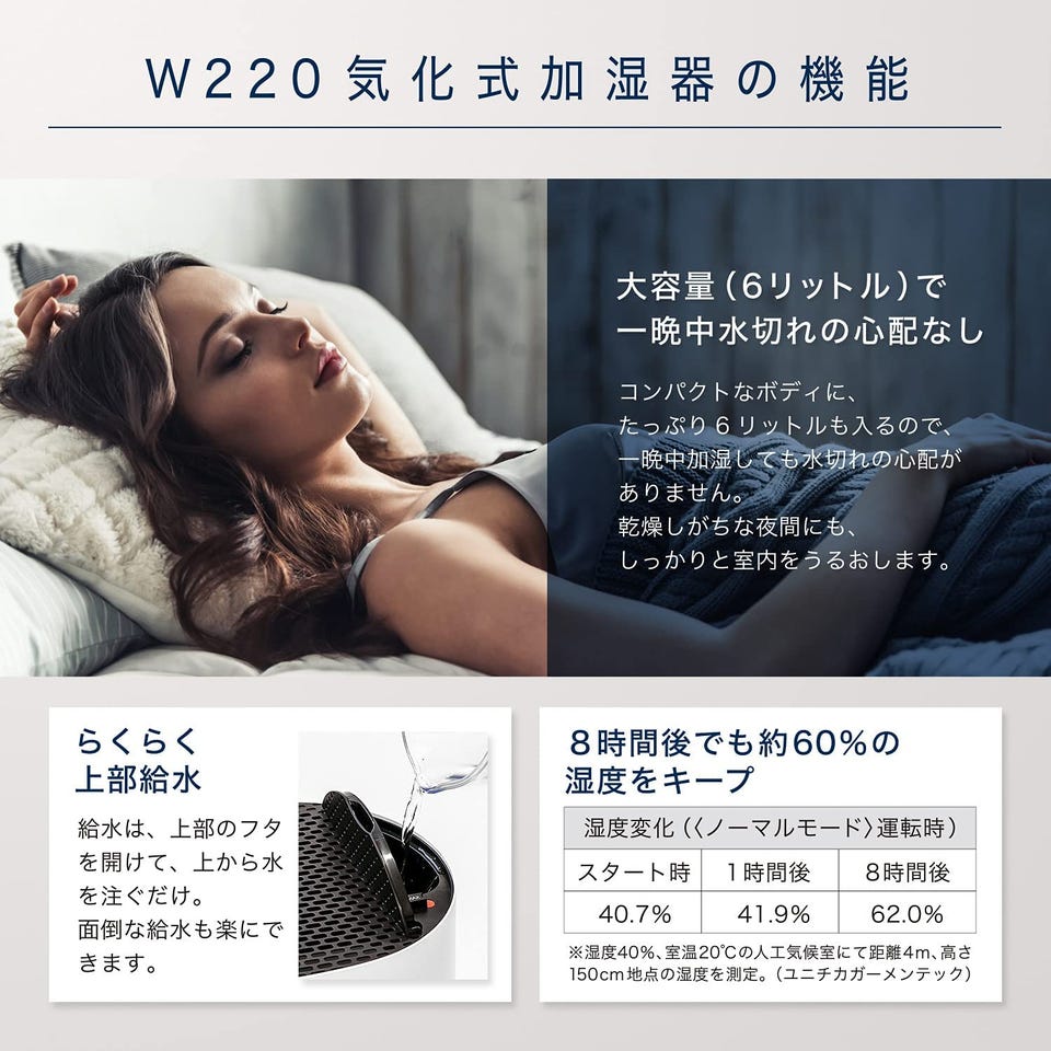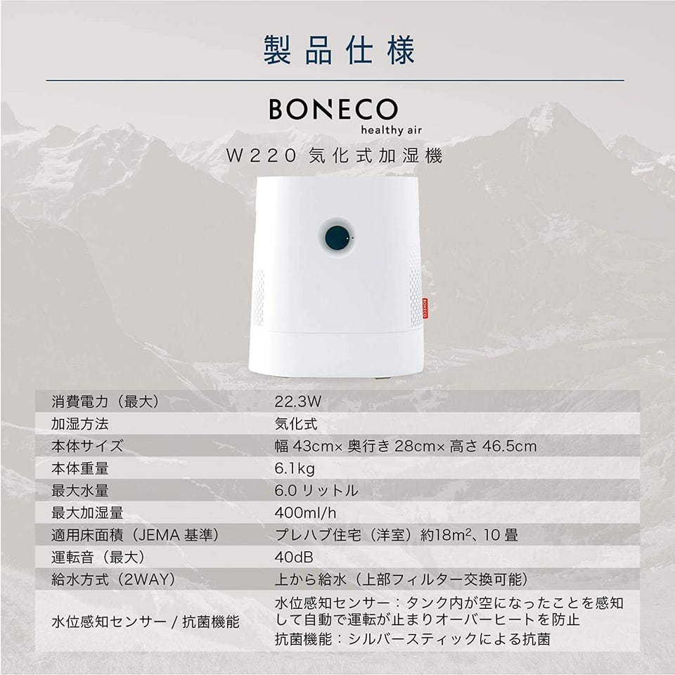 BONECO W220は、水分が気化することで、湿度が高まるしくみを利用した気化式加湿器。