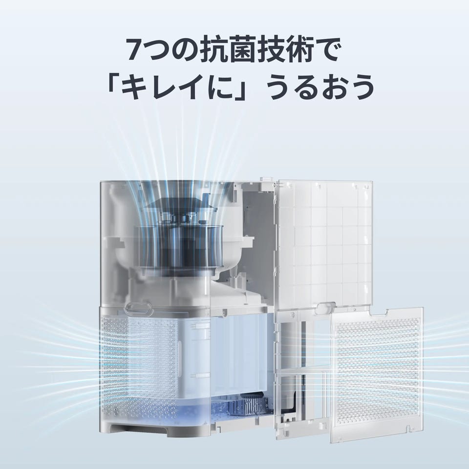 気化式のため、水の粒子が非常に小さく、菌の拡散を防ぎます。抗菌加工素材とAg+抗菌加工により、菌の繁殖と長時間の残存を抑えます。そして、外部からのほこりや異物の混入を防止する空気フィルターや、直接水に浸からず菌やカビが繁殖しにくい宙吊り式フィルターを採用しています。さらに、フィルター自動乾燥技術でカビの繁殖を防止します。これらの優れた抗菌技術により、空気が「キレイ」にうるおう環境を実現します。