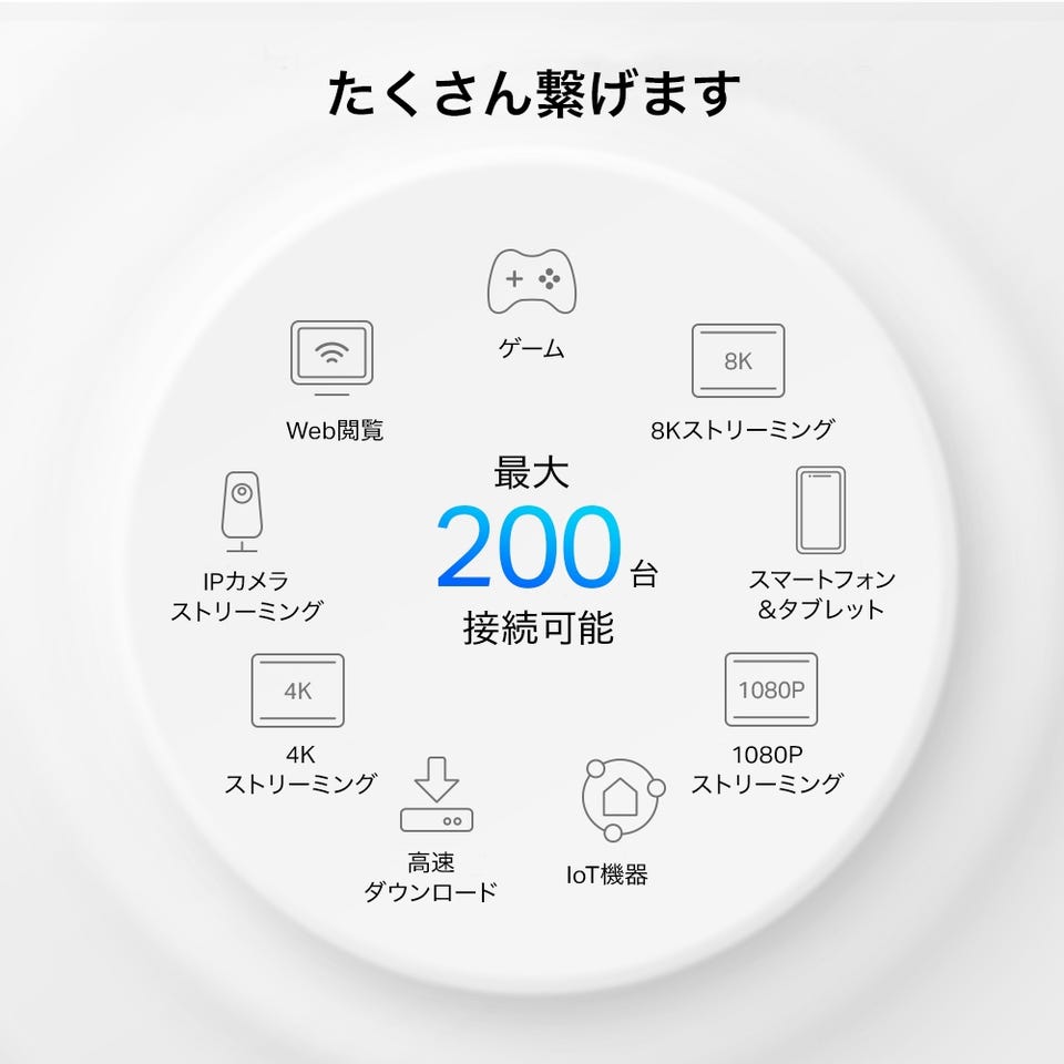ゲーム、8Kストリーミング、スマホ&タブレット、1080Pストリーミング、IoT機器、高速ダウンロード、4Kストリーミング、IPカメラ、ストリーミング、Web閲覧、