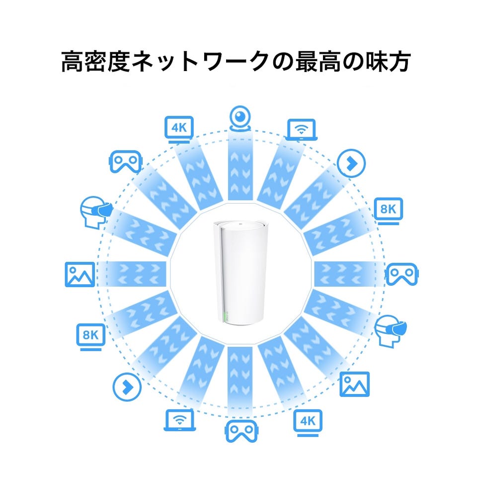 TP-Linkメッシュに対応したDecoは、複数台が連携して単一のSSID(WiFiの名前)を持つ広大なWiFiネットワークを形成します。各スマートフォンやタブレットは、その時に最も速度の出るDecoに自動接続されるので、お家の中を歩き回りながらでも途切れずシームレスに利用できます。(詳細は公式ページをご確認ください。)